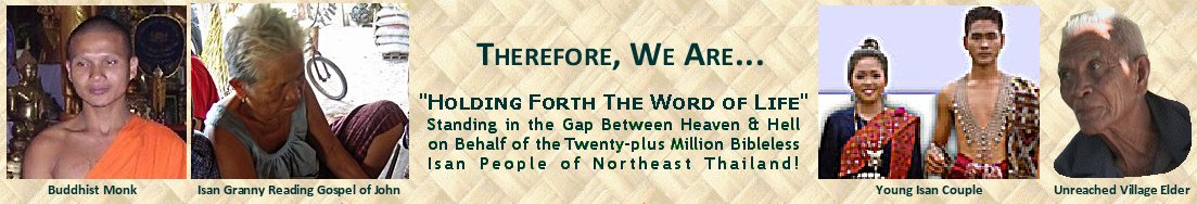 Countless generations of Isan people have been born into this world, totally ignorant of their Creator-God and His Love for them, shown through the Lord Jesus Christ. They love their children, yet rear them in a realm of spiritual darkness—the only way they know—passed down from their forebearers. They exist in a sphere of superstition and fear, placating and sacrificing to evil spirits. How do I know this? Because I have lived among them, and have witnessed it first hand, over and over again! They vainly trust in an idolatrous, works-oriented religious system (Buddhism) ... and in the end, they succumb and pass into a Christless eternity, forever lost and without hope. The tragedy is that this is still happening today, even as you read... An even greater tragedy is, there is a solution: God's Word can instantly illuminate their hearts and dispel the darkness, but they don't have it in their own language... yet! Thus, they are without the knowledge of the love and gracious saving power of their Creator God, Jesus Christ, who came in human form, sacrificially shed His Blood and victoriously rose again, conquering death and purchasing forgiveness and Salvation for one and all. That is what this is all about. It is for this purpose that the Mekong (Isan) Bible Translation Project exists, to translate and expedite the Isan scriptures into the hands (and hearts) of the Isan people, where "Christ is not yet named." The scriptures are always foundational in planting strong indigenous churches. JUST THINK FOR A MOMENT, without the Isan translation, Isan pastors cannot say, "Please open your Isan Bibles to. . . " <silence> Why silence? Because presently, there is no such thing as an Isan Bible, only portions and individual New Testament books in print as we translate, check, and distribute them. The good news is that a new era is dawning for the Isan people. We are working diligently to provide God's Word in their own heart language. The Isan New Testament is now over 90% done, with completed books printed and in use. However, more are needed ... and simply put, we could use your help. First of all, you can answer the call of God for laborers by praying, "Here am I Lord, send me." God uses all kinds of people, with all kinds of skills, gifts and abilities to reach those yet remaining without the Gospel. If after yielded and careful consideration you don't feel you are personally "called to go", you can be very effective by getting behind this project with believing prayer and support, if God so leads. Pray and ask the Lord and consider how He would have you make a difference. The ongoing Isan Bible translation project is certainly worthy of your prayerful consideration and partnership. It is being painstakingly done in crystal-clear spoken Isan and the response has been great. The final goal is that God's Word be accurately "reborn" into the Isan language—following the Byzantine/TR/KJ text form—so that the Isan people might be saved and reborn into God's household of faith. As one missionary so aptly stated, "The Isan Language is in their blood." Accordingly, we seek to see the power of Christ's Redeeming Blood released over their hearts and lives through the medium of their own spoken heart language (their chief means of communication), so that they too can correctly understand who Jesus Christ truly is, i.e., their Creator, Redeemer, The Living Eternal Word, The Great I AM — not merely the "foreigner's religion" as they always incorrectly assume. I am absolutely convinced that God is at the center of this Isan Bible translation endeavor! After all, it's only God's Word that is truly all-powerful, especially when accurately reproduced (translated) into the heart language of any people. Bottom line, the Isan people desperately need to have the Scriptures in their own language, so that they may truly understand and draw upon its life-giving power! Therefore, I am totally committed to this task and do not give up, no matter how rough the going gets or how hard the Enemy fights to prevent it from happening — this is front-line spiritual warfare with over twenty-million souls hanging in the balance. If you are interested in learning more about reaching this vast people group, I am available to present the various aspects of this exciting and urgent ministry to your church group or mission conference. Please don't hesitate to E-mail me (click here) for scheduling and a full-color "Spotlight on Isan" brochure containing further information about the Isan people and their needs(cover flap shown on brochure page).