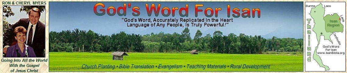 Now, years later, it is clearly evident that God has blessed the Myers' ministry, and that He is using the various Isan Scripture books that have been completed, checked, printed and distributed. (SEE: Endorsements & Testimonials) The Isan New Testament is now completed and in print, along with the book of Genesis and other Old Testament portions necessary for background teaching, starting from Creation and its Creator, to fully comprehend the Gospel message. The potential outreach of the Isan Scriptures is in the tens of millions, and is now beginning to reach across Thailand's borders into Laos and beyond, far beyond the scope of the Myers' original ministry and exciting beyond their fondest imagination.